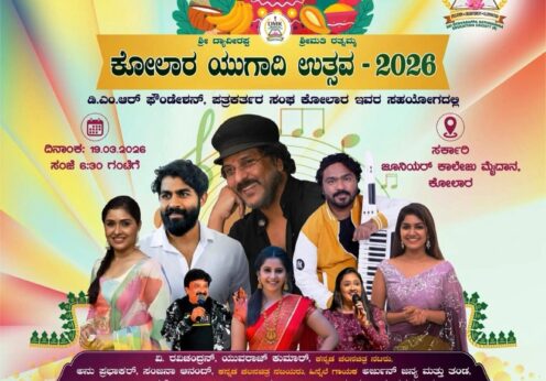 ಕೊಲಾರದಲ್ಲಿ ನಡೆದ “ಕೊಲಾರ ಯುಗಾದಿ ಉತ್ಸವ – 2026” ಕಾರ್ಯಕ್ರಮ ಭರ್ಜರಿ ಯಶಸ್ಸು ಕಂಡಿದೆ. ಮಾರ್ಚ್ 19ರಂದು ಸಂಜೆ 6:30 ಗಂಟೆಗೆ ಜೂನಿಯರ್ ಕಾಲೇಜು ಮೈದಾನದಲ್ಲಿ ಆಯೋಜಿಸಲಾಗಿದ್ದ ಈ ಮಹೋತ್ಸವಕ್ಕೆ ಸಾವಿರಾರು ಸಂಖ್ಯೆಯಲ್ಲಿ ಜನರು ಆಗಮಿಸಿ ಸಂಭ್ರಮಿಸಿದರು. ಡಿ.ಎಂ.ಆರ್ ಫೌಂಡೇಶನ್ ಹಾಗೂ ಪಠ್ಯತರ ಸಂಘದ ವತಿಯಿಂದ ನಡೆದ ಈ ಕಾರ್ಯಕ್ರಮ ಯುಗಾದಿ ಹಬ್ಬದ ಉತ್ಸಾಹವನ್ನು ಮತ್ತಷ್ಟು ಹೆಚ್ಚಿಸಿತು. ಕಾರ್ಯಕ್ರಮದಲ್ಲಿ ಖ್ಯಾತ ಗಾಯಕರು, ಕಲಾವಿದರು ಹಾಗೂ ಸ್ಥಳೀಯ ಪ್ರತಿಭೆಗಳು ಮನಮೋಹಕ ಪ್ರದರ್ಶನ ನೀಡಿದರು. ಸಂಗೀತ ಕಚೇರಿ, ನೃತ್ಯ ಕಾರ್ಯಕ್ರಮಗಳು…